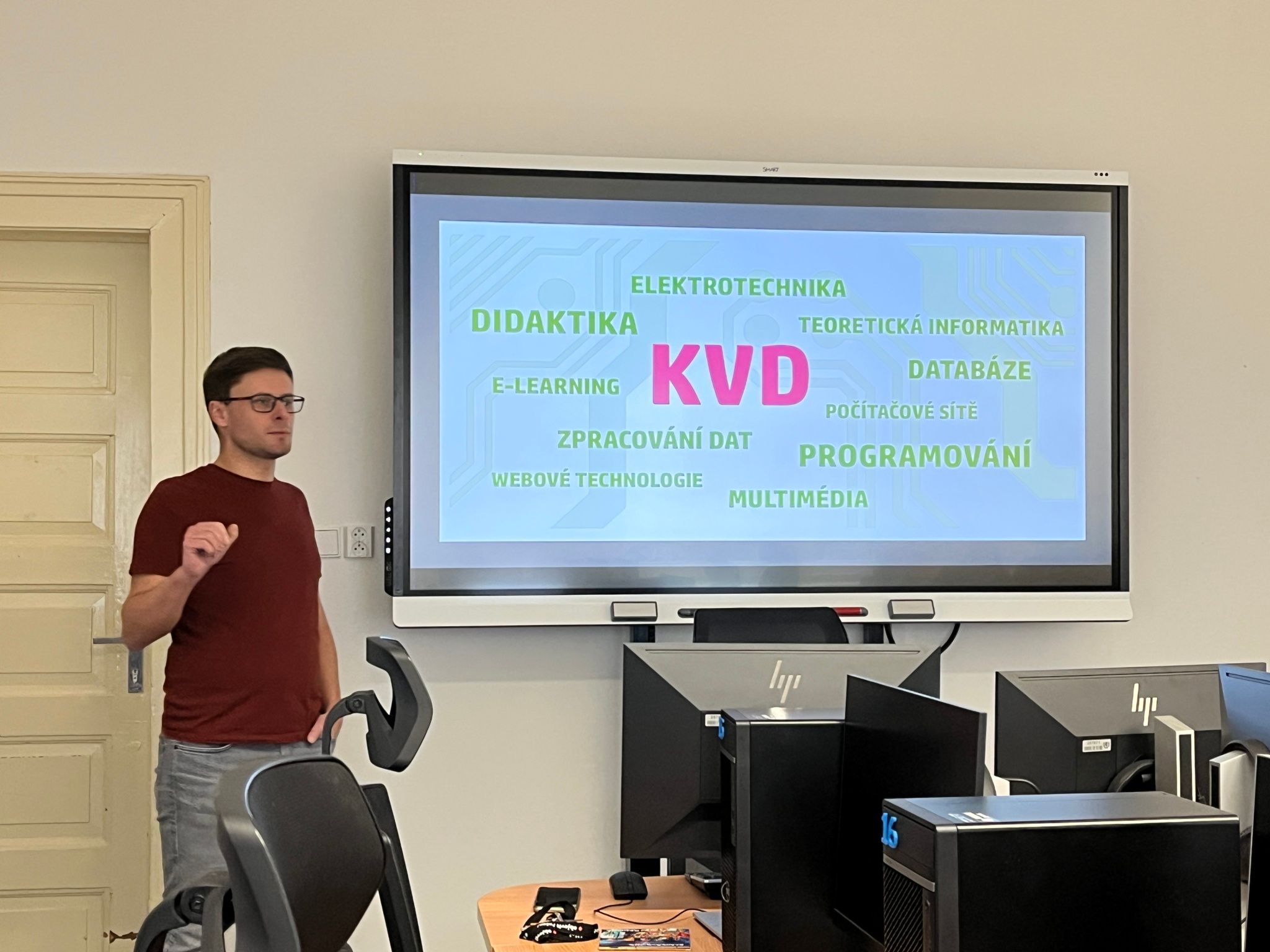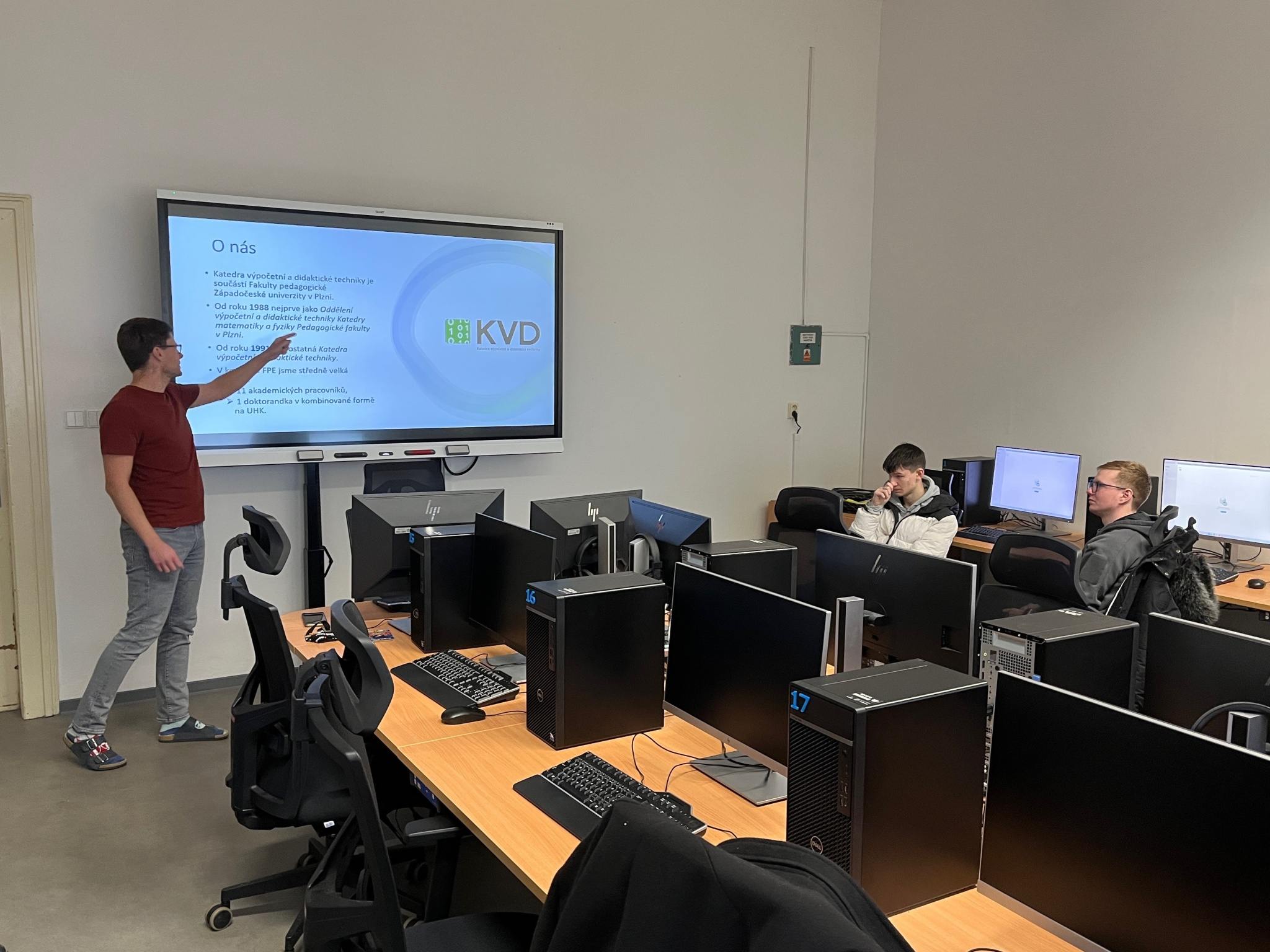 Na úvod nás přivítal vedoucí katedry, který žákům přiblížil možnosti studia a objasnil systém fungování vysokoškolského studia. Díky jeho výkladu si žáci mohli udělat jasnější představu o tom, jaké předměty a odborné zaměření je na této katedře může čekat.