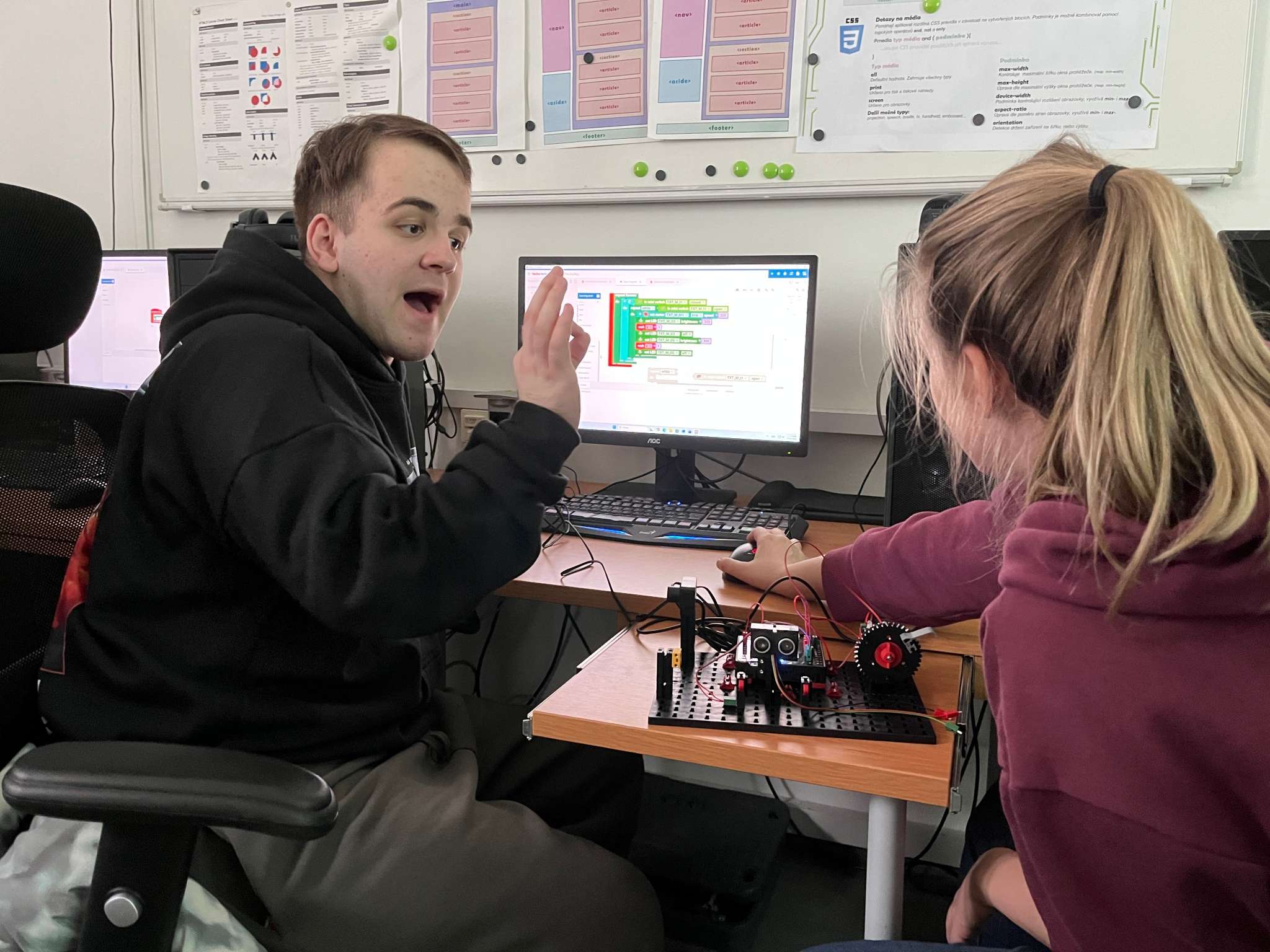 Po obědové pauze následovala druhá část programu zaměřená na programování stavebnic FischerTechnik. Při této aktivitě si žáci prakticky ověřili své logické myšlení a schopnost řešit technické úlohy pomocí programování.